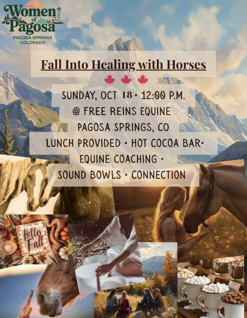 Join us and the Women of Pagosa in a healing workshop with horses. Hosted by Free Reins Equine, we are looking forward to seeing you for equine facilitated coaching, sound bowls, and connection with others.